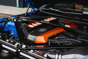 Visually you will notice it rides on G-POWER’s in-house developed HURRICANE RR alloy wheels finished in a striking front-polished orange, providing a stunning contrast to the Voodoo Blue paintwork.