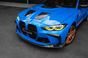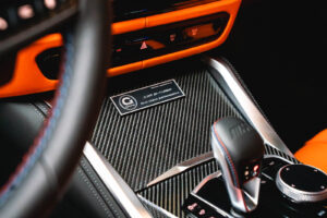 A standout feature is the G-POWER VENTURI carbon fibre hood, which not only enhances the car’s aesthetics but also improves engine bay thermal management. The showcased model sports the RS version, partially colour-matched to the body. Further carbon additions include the front spoiler, kidney grilles, and front corners. Under the hood, a GP-Orange carbon engine cover adds a touch of detail.