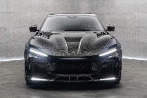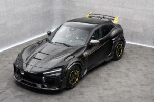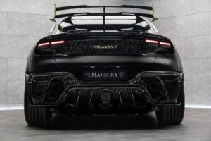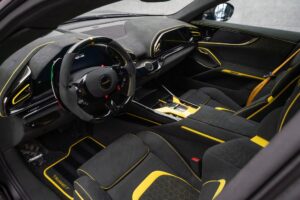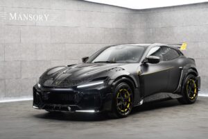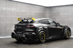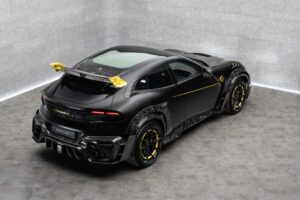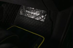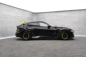The wheels measure 22″ at the front and 23″ at the rear, featuring black spokes and yellow accents. Adding to this, Mansory has fitted forged carbon fender flares over the original ones. More carbon fibre detailing extends along the sides with rocker panels and trim behind the windows.