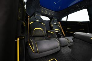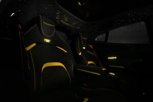 Inside, numerous changes have been made, though they are comparatively more subtle. The seats, door panels, and dashboard are now upholstered in new soft-touch black Alcantara with yellow piping and stitching. Yellow seat belts and a Rolls-Royce-inspired starlight headline have also been added.