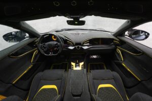 At the back, there is a complex roof spoiler with yellow endplates and a forged carbon fibre bumper and diffuser, along with quad-stacked exhausts reminiscent of an older Ferrari California.
