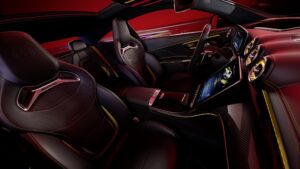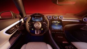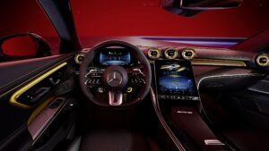 Both the Coupe and Cabriolet come with the Pinnacle Trim, which includes digital light headlights with projections, a head-up display, and MBUX augmented video for navigation. The AMG Dynamic Plus Package with active engine mounts and AMG Real Performance Sound are standard, enhancing the driving experience with simulated engine acoustics. An AMG fuel cap in silver chrome with black design elements and a custom indoor car cover are also included.