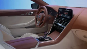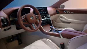 Inside, the Speedtop continues to separate itself with a bespoke interior, mixing white and brown leather, and a ‘BMW Concept Speedtop’ script etched into the centre console. Up front, it remains familiar, carrying over the 8 Series dashboard with its 12.3-inch digital display.