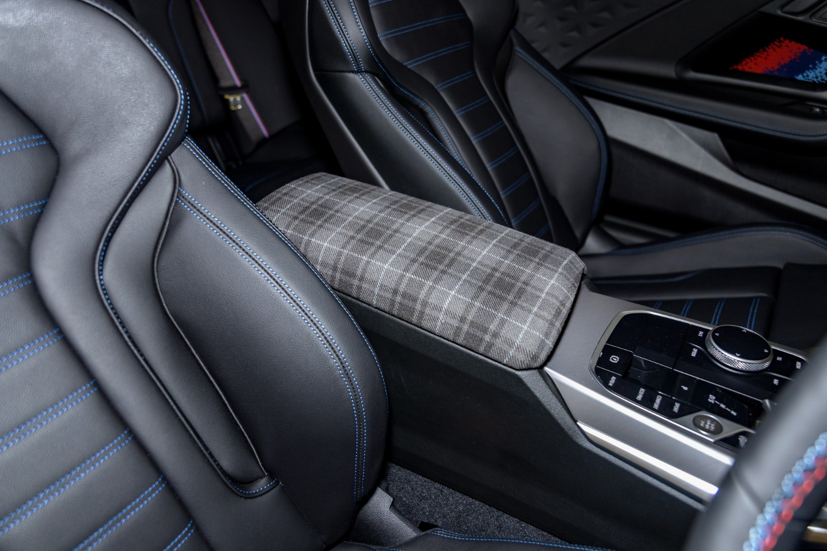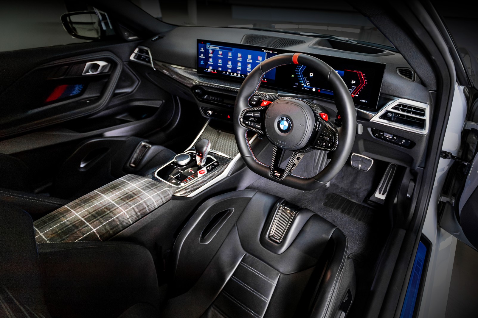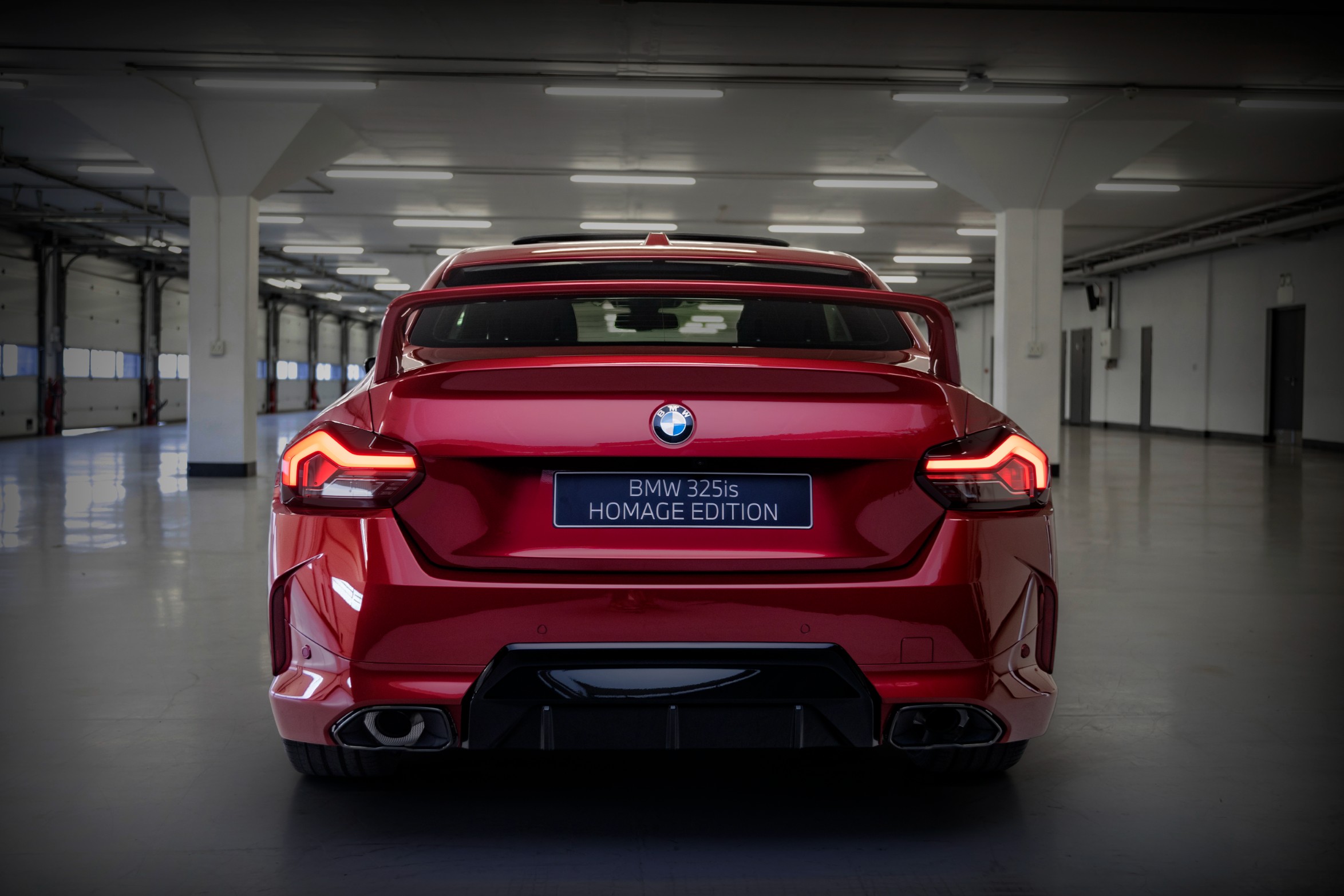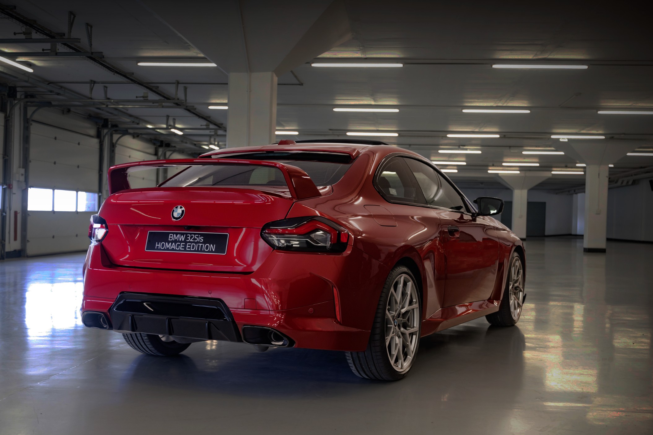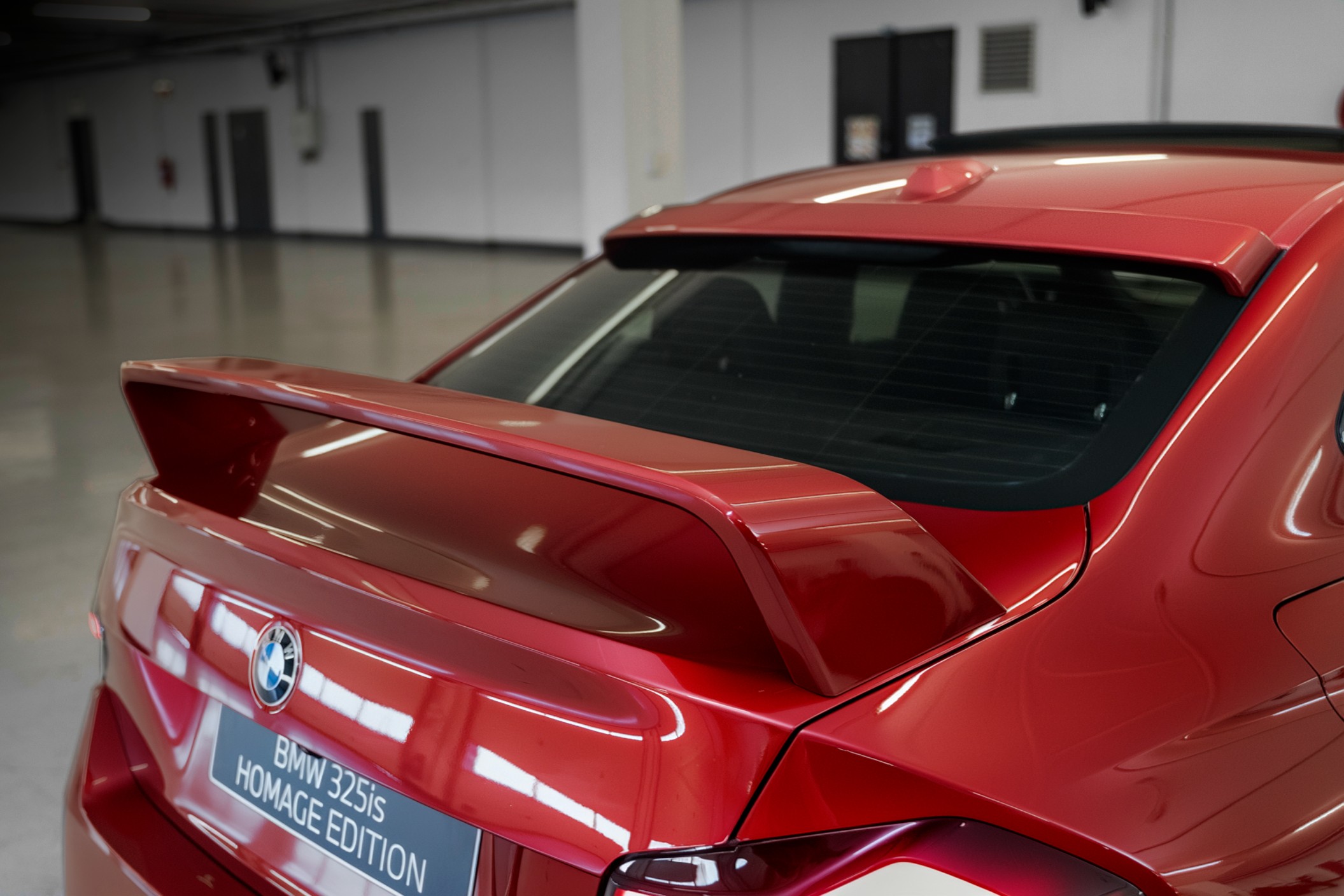 BMW 325iS Homage: double rear spoiler, classic-style wheels, M Sport Pro package, M Sport seats, front splitter, tartan-pattern Überkaro armrest trim from the original car, black door handles, 1-of-33 commemorative plaque, and colours including Mineral White, Sapphire Black, Skyscraper Grey, and Fire Red.