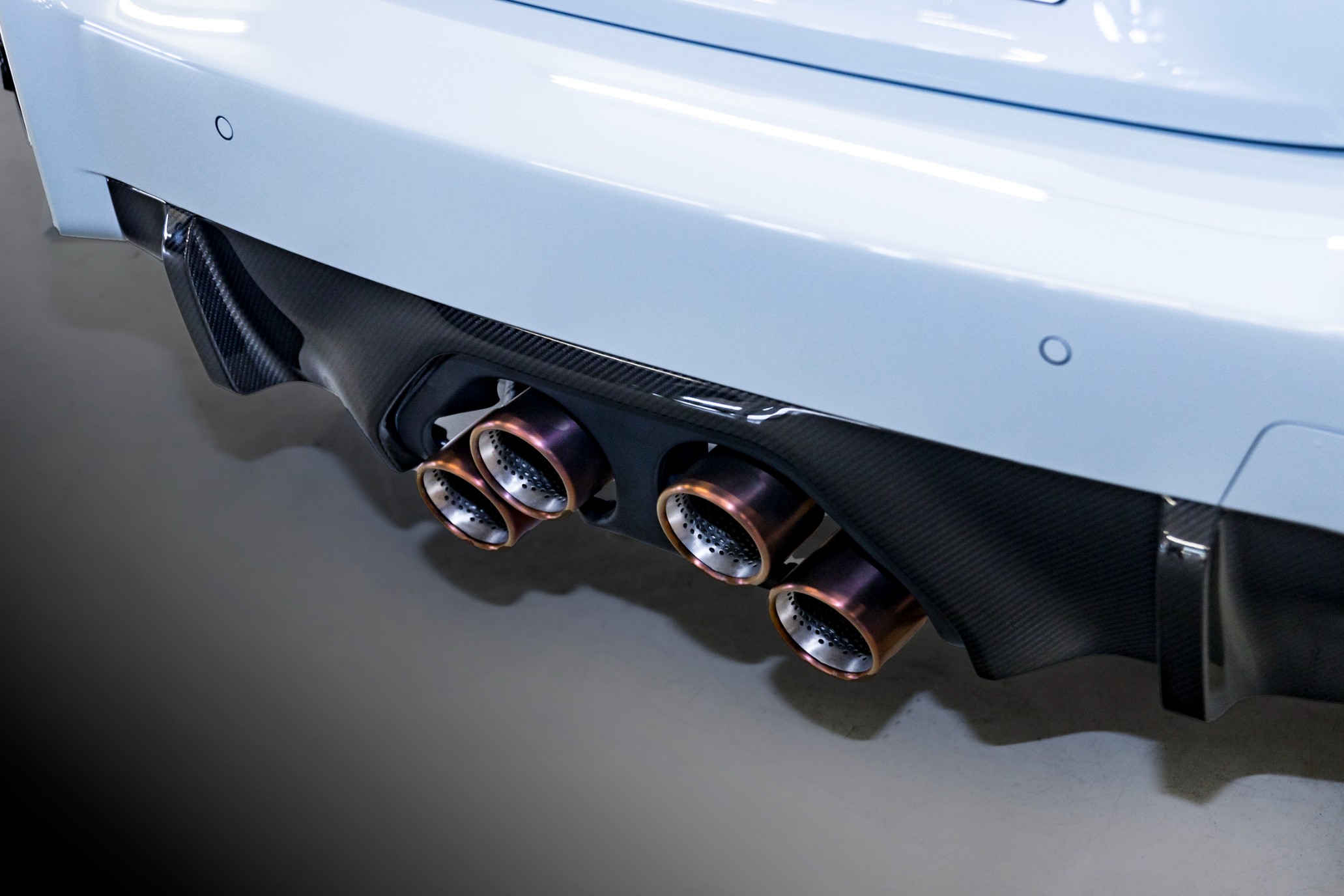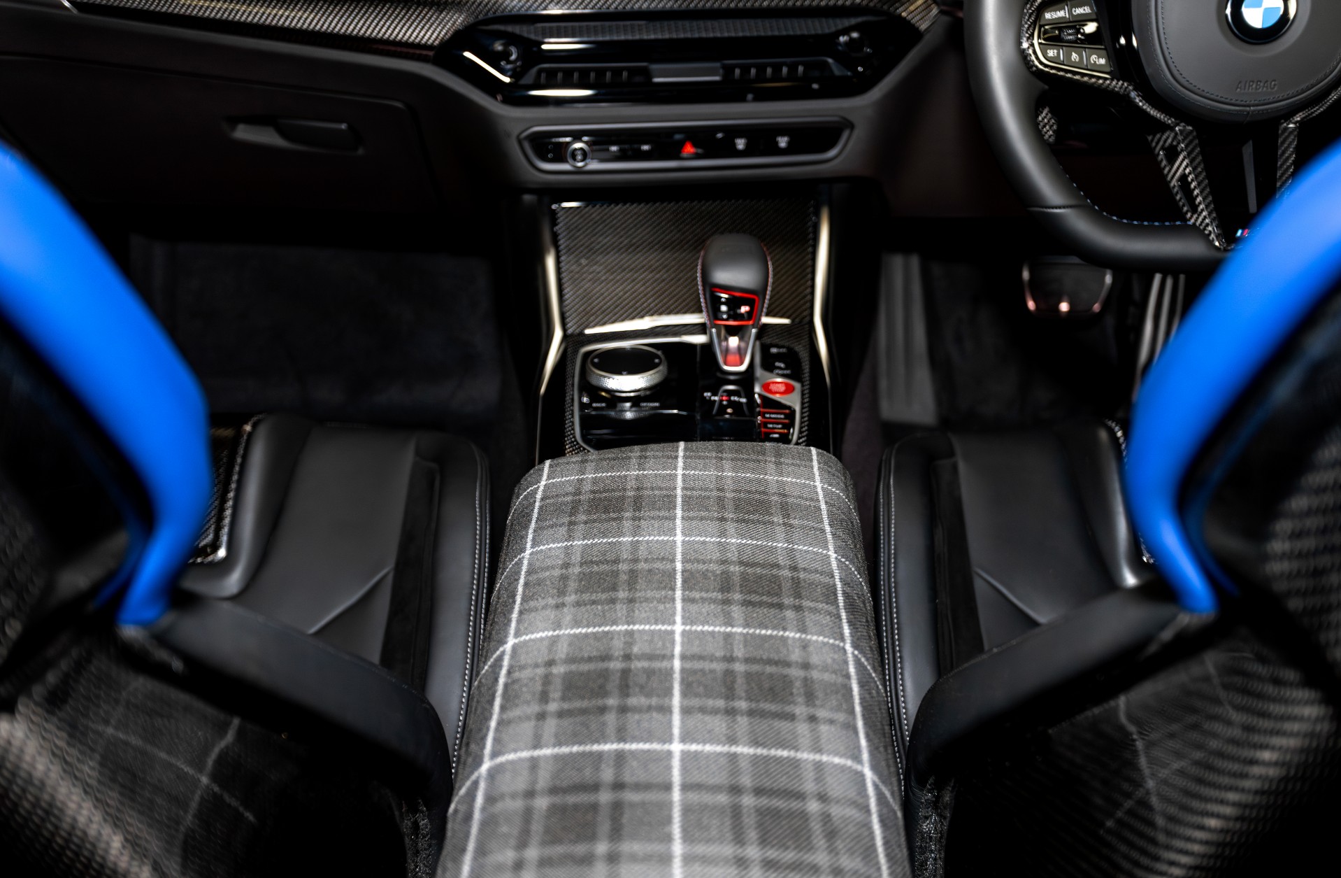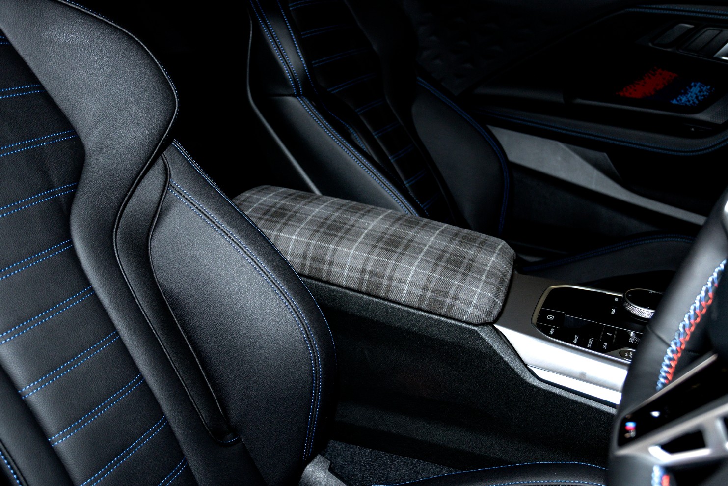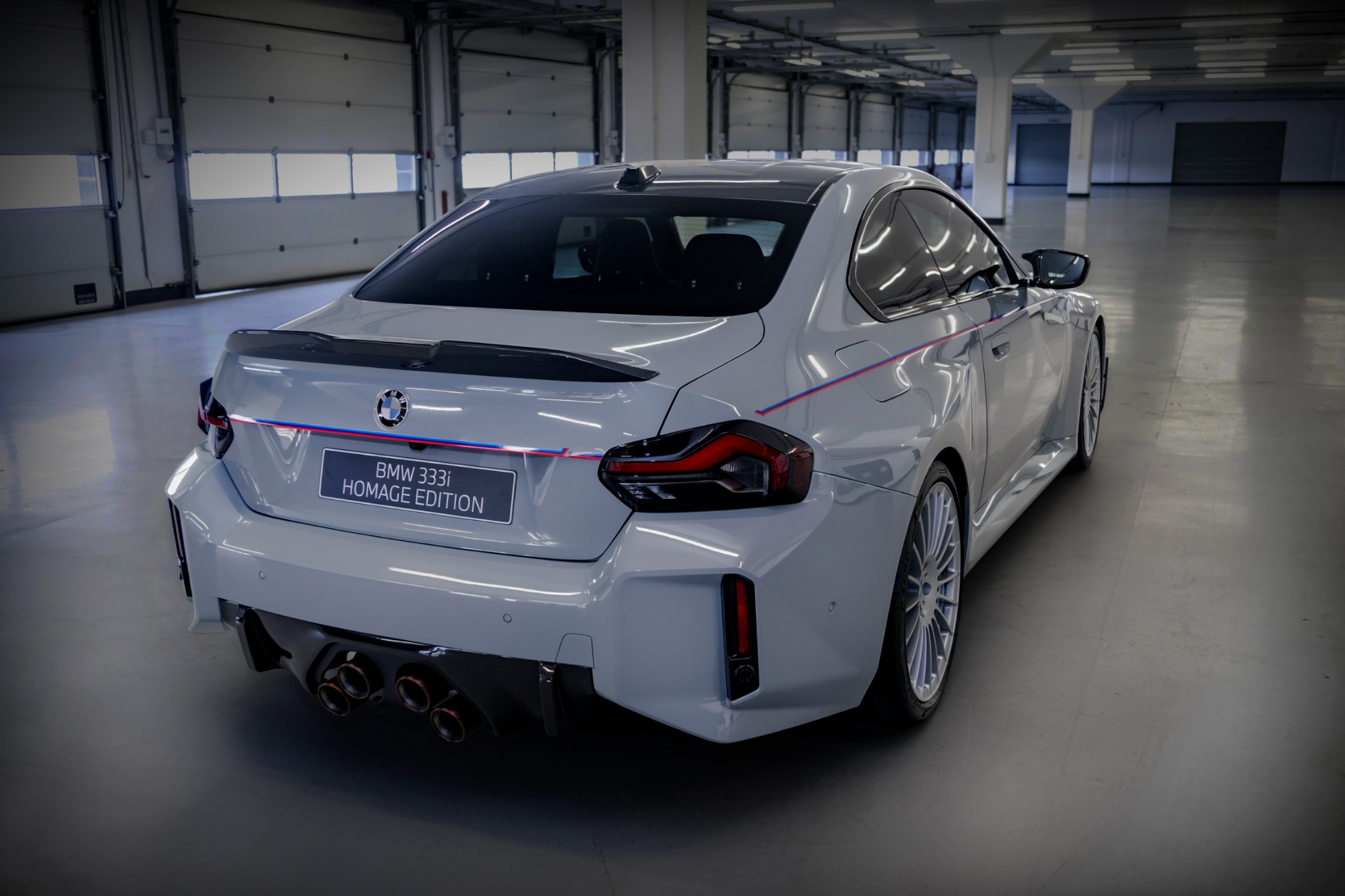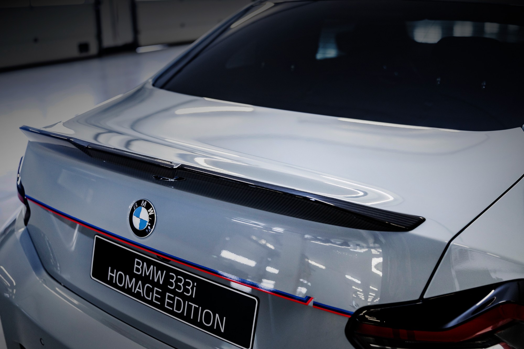 BMW 333i Homage: Alpina wheels, “333i Homage” decals, quad tailpipes, custom front splitter and spoilers, carbon bucket seats, tartan-pattern Überkaro armrest trim, 1-of-33 plaque, and finishes like Alpine White, Sapphire Black, Brooklyn Grey, Zandvoort Blue, and Fire Red.
