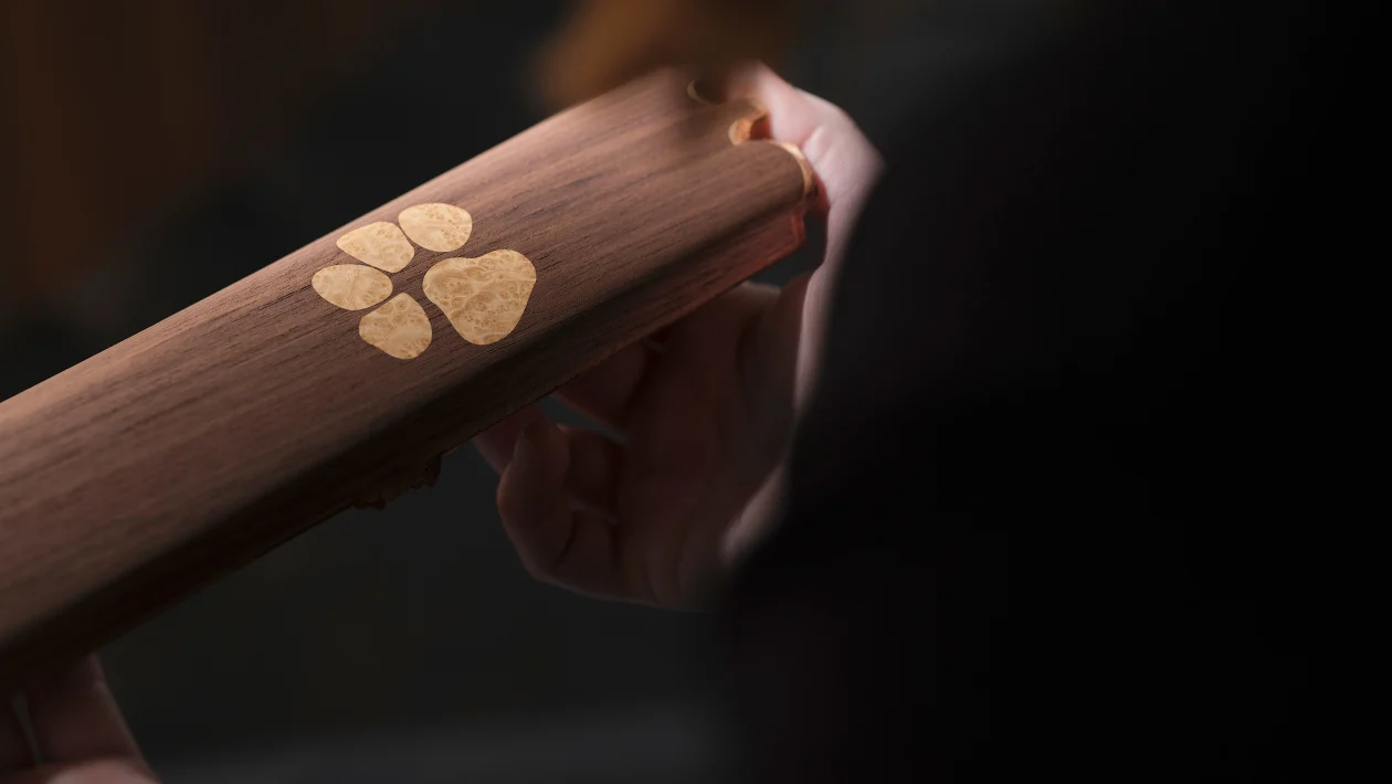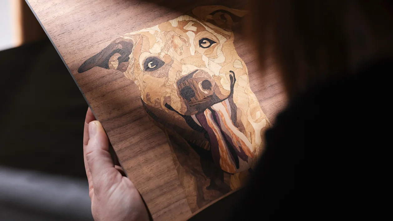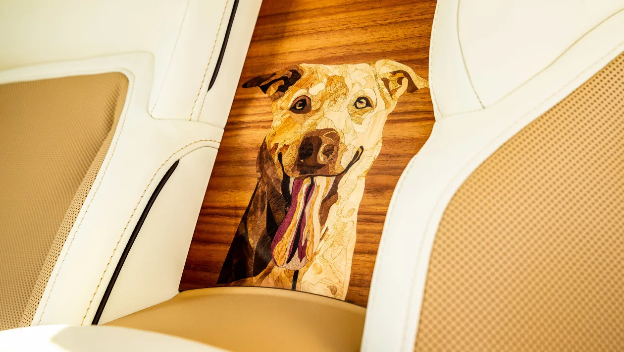 Inside, the cabin is trimmed in Moccasin and Crème Light leather with Dark Spice and Casden Tan accents, chosen to mirror Bailey’s coat. The woodwork is finished in High Gloss Royal Walnut veneer. The highlight is a stunning portrait of Bailey set between the rear seats, crafted from more than 180 pieces of veneer and taking over four months to complete. Nine types of natural veneer were used, carefully selected for their colour, pattern, and grain direction to replicate the dog’s fur texture.