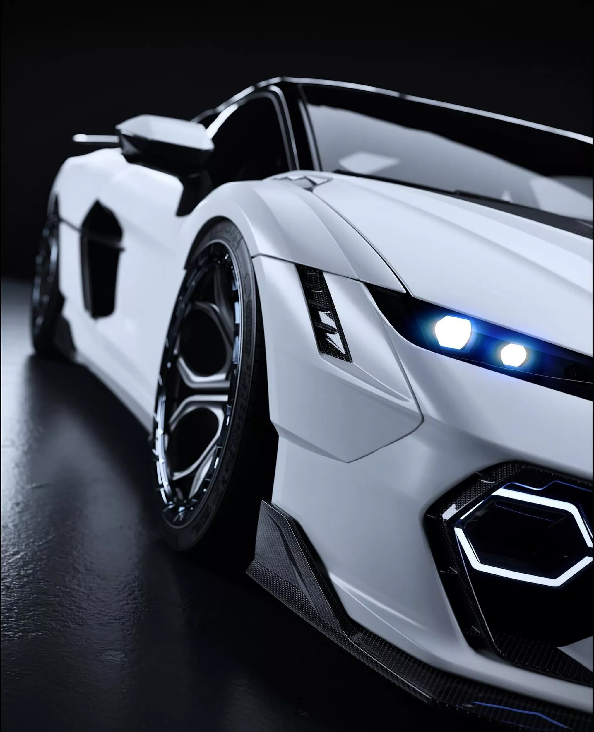 Up front, the makeover starts with a two-tier splitter and aggressive bumper wings. The hood and fenders get fresh vents cut in, while the front and side air intakes have been reshaped. The side pieces now feature arrowhead elements that flow right into those newly swollen rear arches.