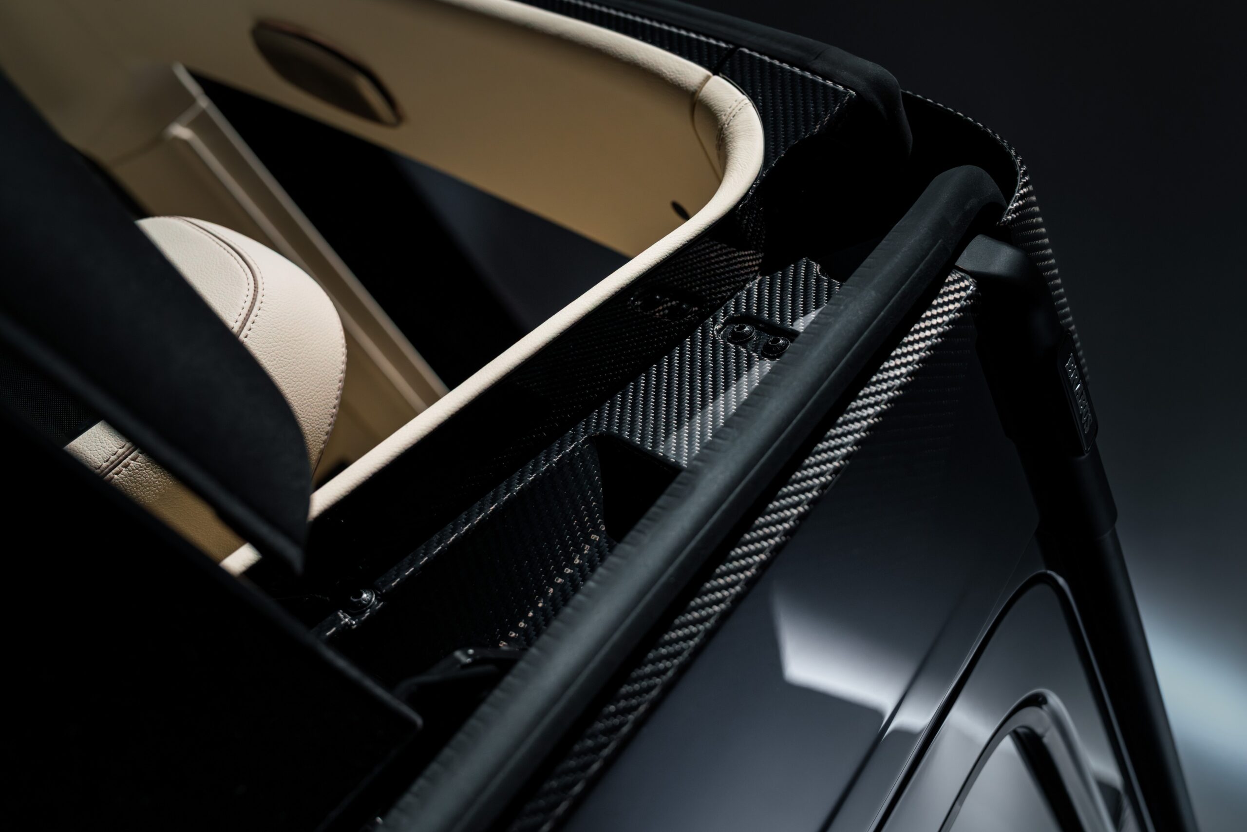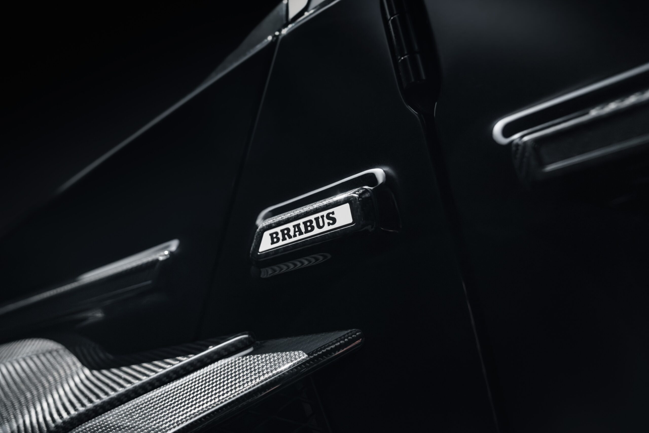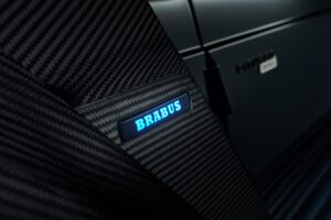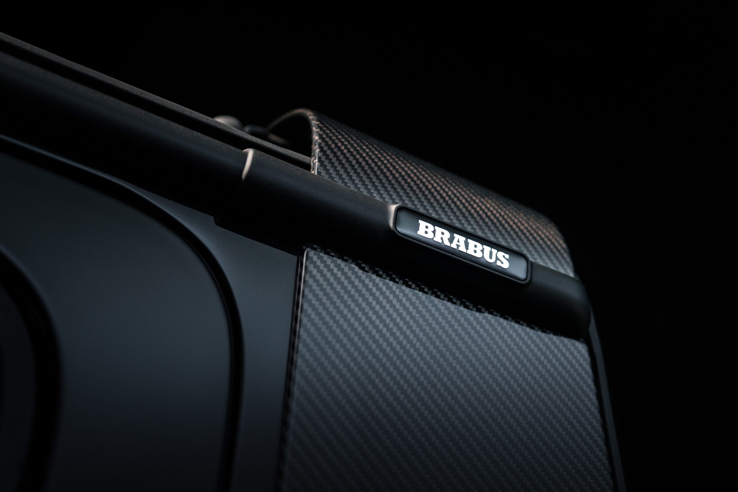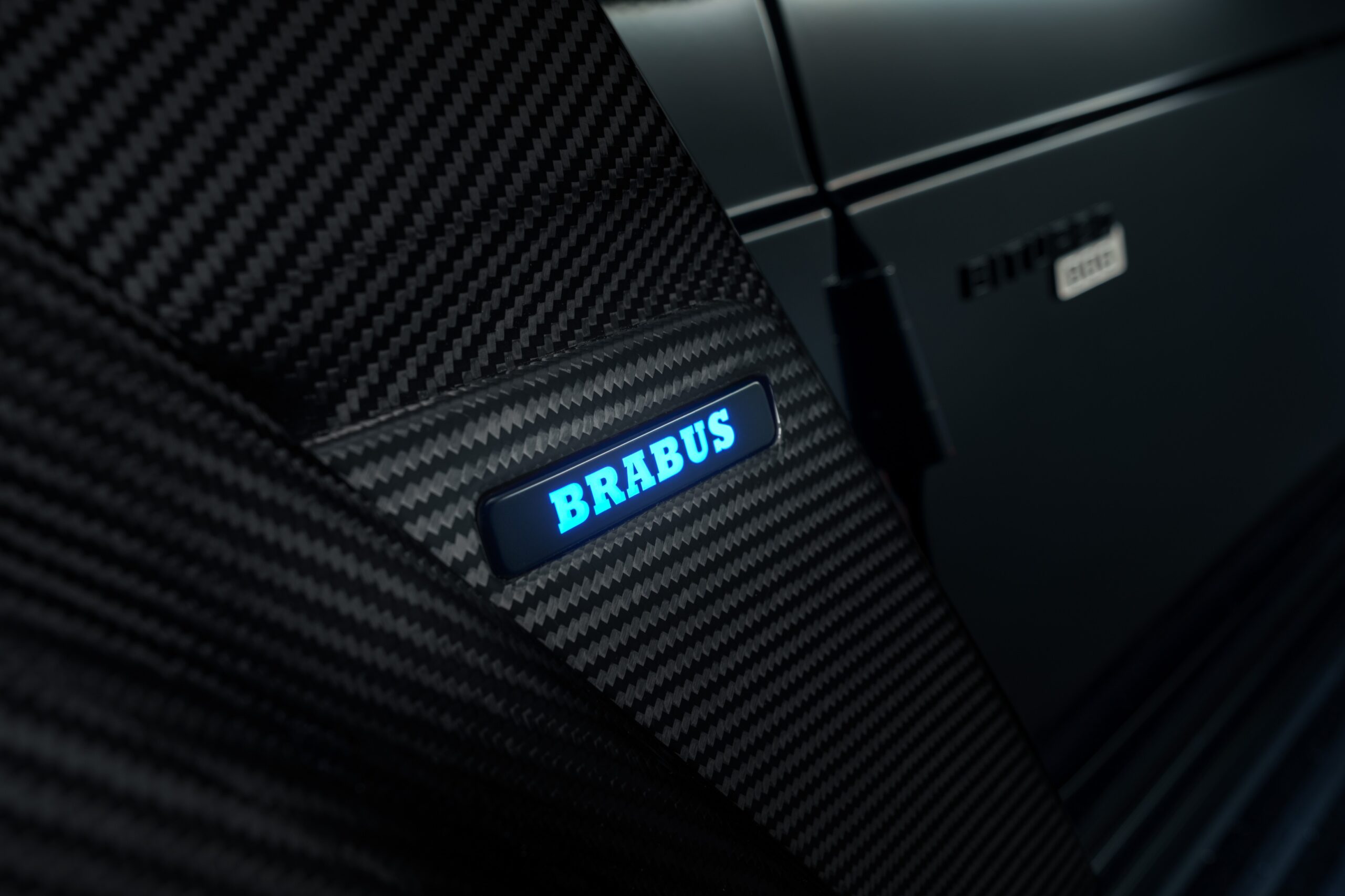 Inside, the show continues with a Masterpiece cabin. The Shell-design quilting is crisp across the panels, footwells and mats, while the seats use the same pattern with pinpoint perforation to keep ventilation working. Neck-level heating in the headrests makes roof-down driving easy even in colder weather. Carbon trim, illuminated scuff plates, anodized lock pins and BRABUS pedal pads complete the look. Rear passengers also benefit from Easy Entry hinges that let the back doors open a full 90 degrees.