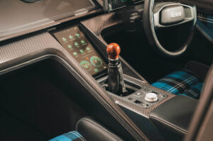 Inside, the blend of eras becomes obvious. A 10.1-inch infotainment display and a 10.25-inch driver cluster sit alongside a wooden gear selector, classic mirror and original indicator stalks. Safety is a major upgrade too, with an integrated carbonfibre cage because the early Esprit offered almost no rollover protection.