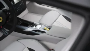 This is the first time horsehair has appeared in a factory-built Ferrari, but it is not the only surprise. The car also features white brake calipers paired with white gearshift paddles, a combination rarely seen on a Prancing Horse.