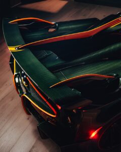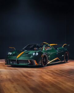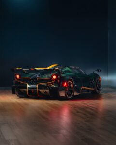 The Huayra 70″ Trionfo” uses the Huayra Roadster as its foundation, yet introduces significant visual and aerodynamic changes. The bodywork is finished in exposed green carbon fibre with orange detailing. Up front, the splitter looks sharper and more purposeful, while the rear is dominated by a large fixed wing and an aggressive diffuser.