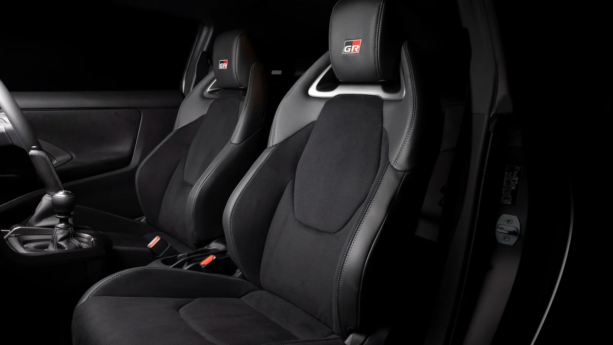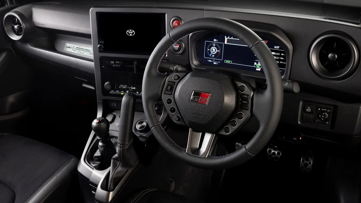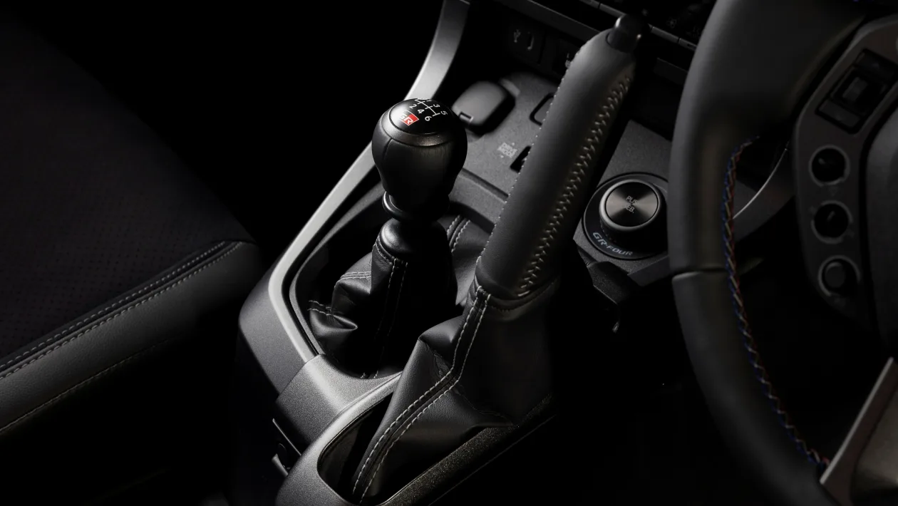 Interior revisions are subtle but meaningful. A slightly smaller steering wheel takes cues from the GR Yaris Rally2, along with a revised button layout inspired by the competition car. The handbrake is now leather-wrapped and mounted vertically, a nod to proper rally technique and a clear signal that this car is about involvement, not just appearance.