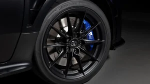 So what actually changes on the Toyota GR Yaris Sébastien Ogier 9x World Champion Edition? The headline update is the addition of the Aero Performance Package introduced in 2025. That brings an adjustable rear wing, bonnet scoop, front lip spoiler, wheel arch vents and revised fuel tank covers designed to smooth airflow underneath the car. The special edition also debuts a new Black Gravite matte finish, contrasted by blue brake calipers and a subtle tricolour detail within the grille.