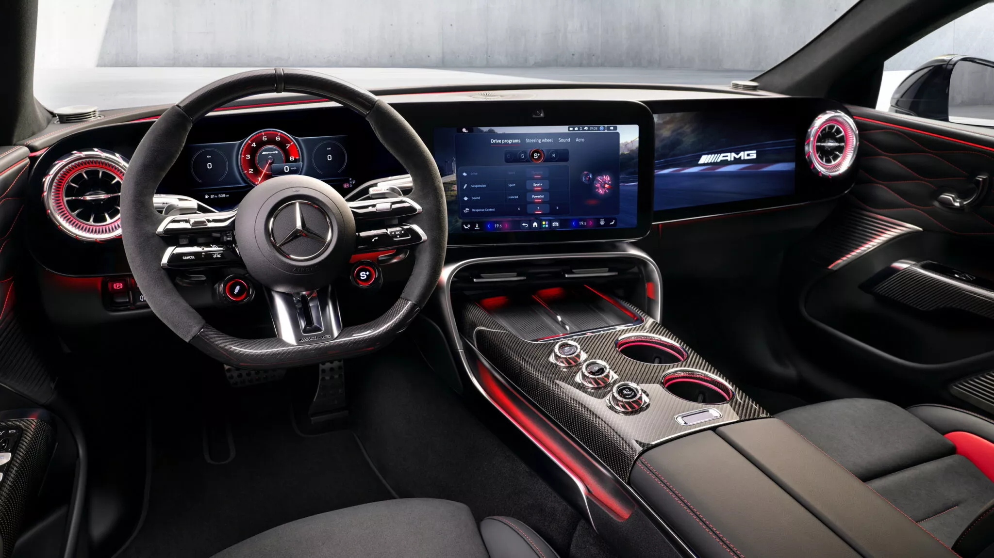 The interior carries several design details unique to AMG models. The air vents are illuminated and shaped to resemble jet turbines, while the flat-bottom steering wheel features carbon accents and integrated haptic controls. Buyers will also be able to specify AMG Performance seats, and a distinctive wing-shaped metal element stretches across the centre console to tie the design together.