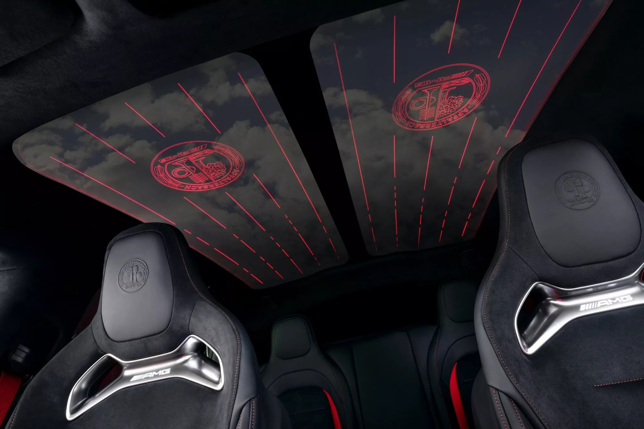 Another eye-catching piece of technology is the Sky Control panoramic roof. The glass panel can switch between transparent and opaque modes at the touch of a button, but it also brings a bit of theatre after dark. When ambient lighting is active, the roof can project AMG logos or racing stripe patterns across the glass surface, adding a visual flourish to the cabin.