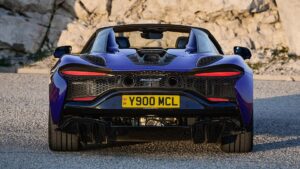 The Spider’s retractable hardtop roof can open or close in 11 seconds and adds 62 kg to the car’s kerb weight, now 1562kg – which McLaren boasts still makes the Artura Spider lighter than coupe versions of some rivals.